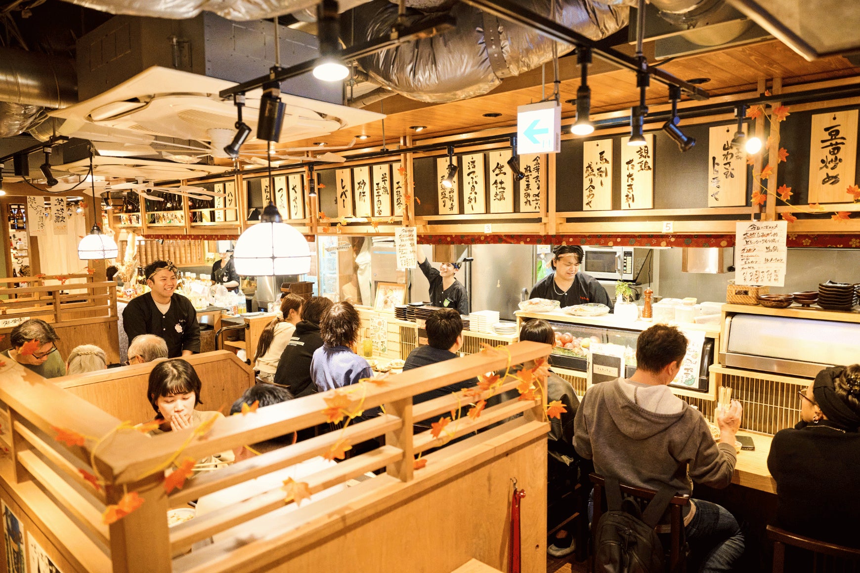 都心からのお仕事帰りにふらっと普段づかいしていただけるよう、ゆったりとしたカウンター席を多く設け、もちろんちょっとした仲間との宴会にテーブルやお座敷席もご用意。