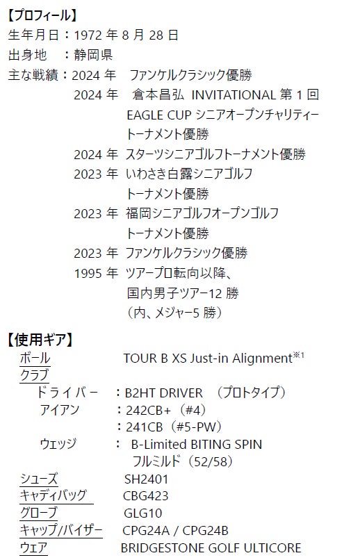 「すまいーだカップシニアゴルフトーナメント」で今シーズン1勝目を飾ることができ、とてもうれしく思います。2日目に62でプレーし、さらに風雨の強まる最終日もスコアを伸ばせたことは、B2 HTドライバーの飛びと方向性を兼ね備えた性能と、ツアーB XS ボールの風に負けない高いコントロール性能、ゼロ・スパイク バイター ツアーのグリップ力の素晴らしさにあったかと思います。