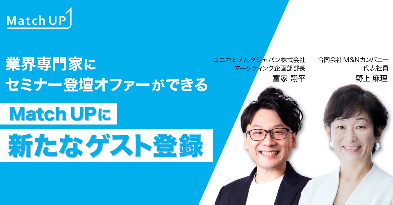 業界専門家にセミナー/イベント登壇のオファーができる「Match UP」 合同会社M&Nカンパニーの野上 麻理氏、コニカミノルタジャパン株式会社の富家 翔平氏などが新たにゲスト登録!