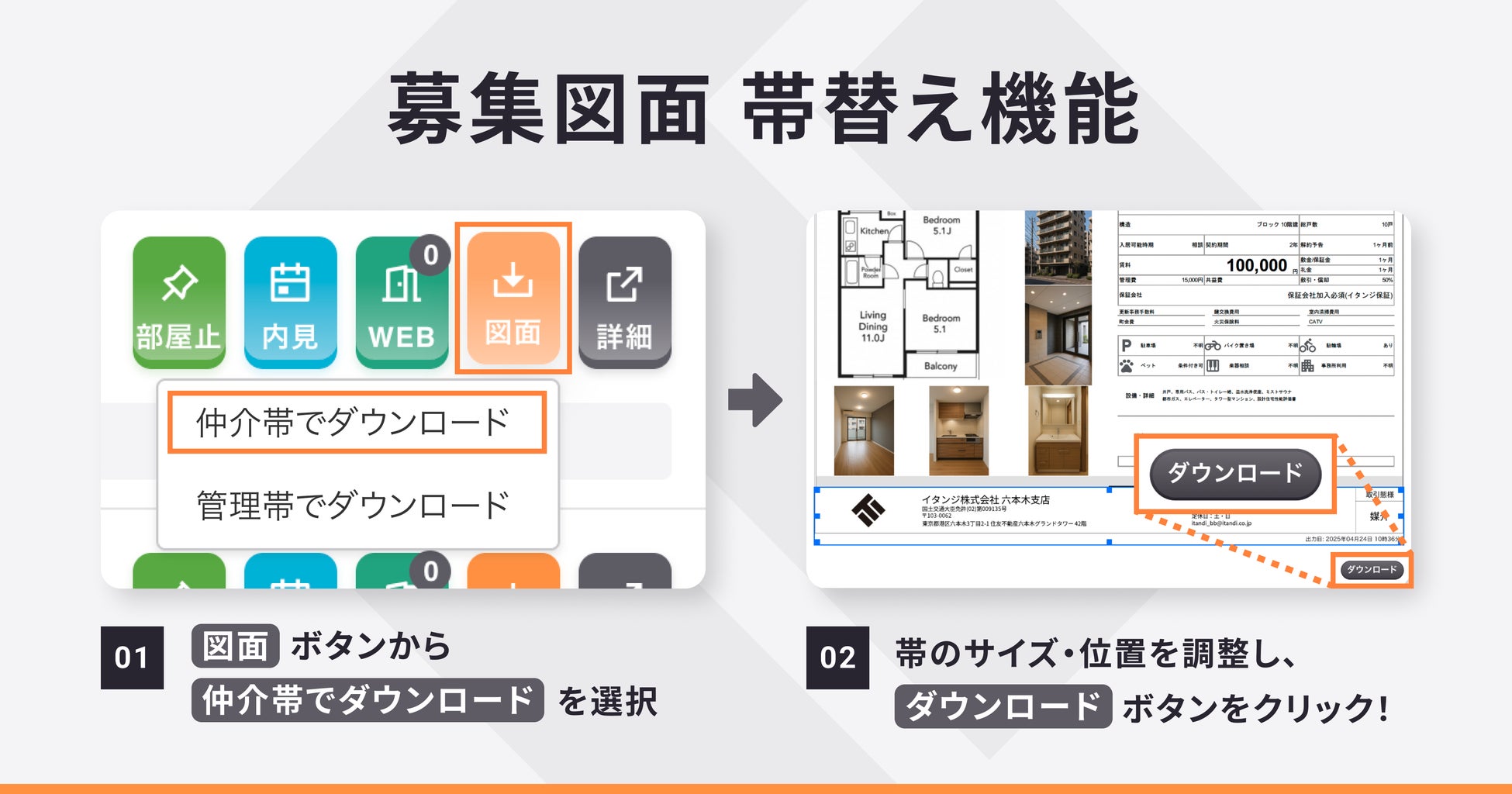 仲介会社では、入居希望者へ物件を提案する際、物件情報サイトから募集図面をダウンロードし、「帯情報」と呼ばれる会社名や連絡先などを、自社の情報に変更する「帯替え」という業務が日常的に行われています。帯替え業務はコピー機などで手作業で行われることもあり、日々多くの時間と手間がかかっています。