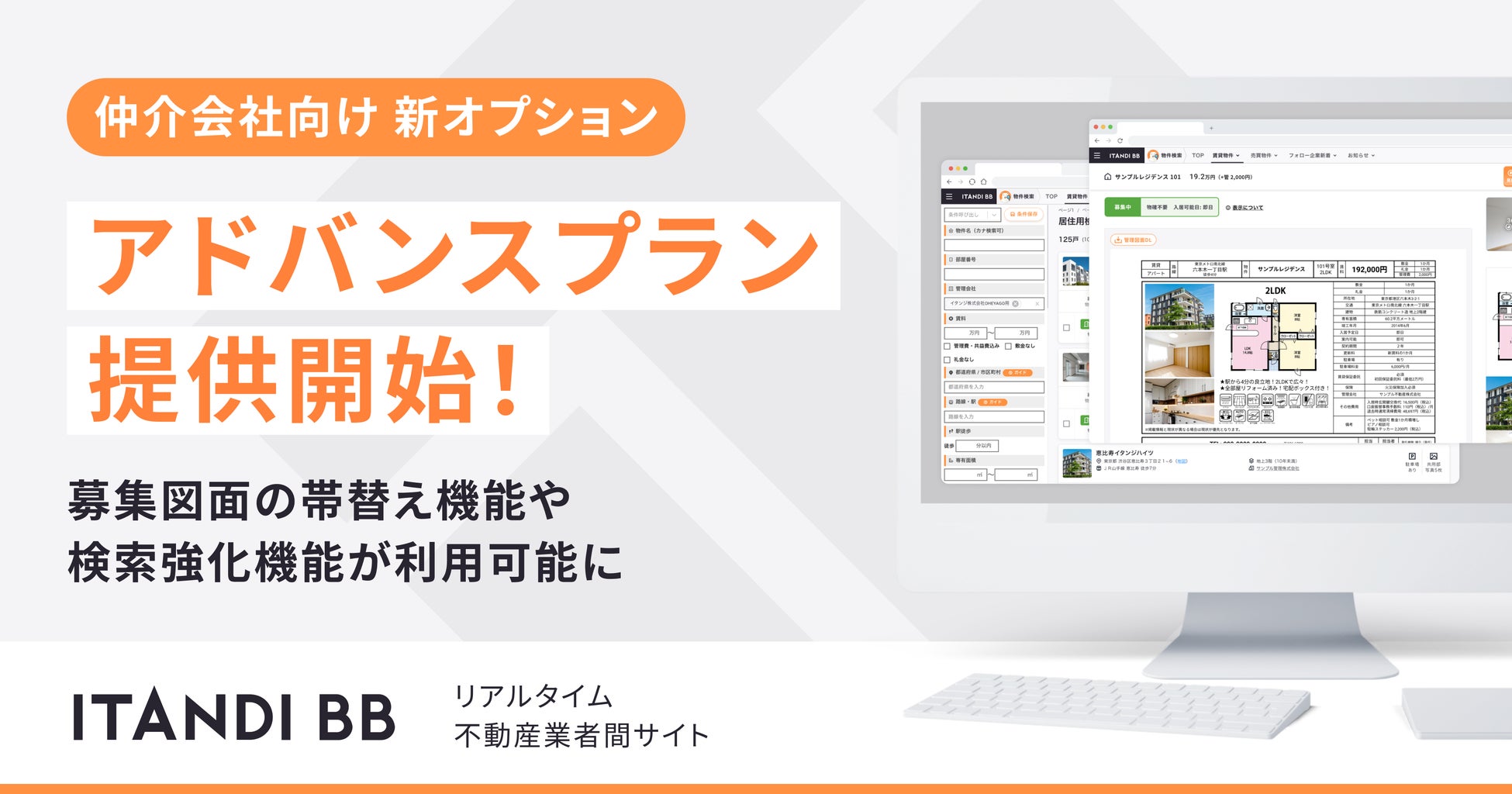 テクノロジーで不動産取引をなめらかにするイタンジ株式会社(以下「当社」)は、2025年5月13日より、当社が提供するリアルタイム不動産業者間サイト「ITANDI BB(イタンジビービー)」において、募集図面の帯替え機能をはじめとした有償オプションであるアドバンスプランの提供を開始いたします。