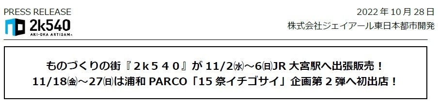 ものづくりの街『2k540』が11/2㈬~6㈰JR大宮駅へ出張販売!11/18㈮~27㈰は浦和PARCO「15祭イチゴサイ」企画第2弾へ初出店!