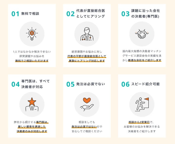当社の経営経験者が経営課題をヒアリングし、解決できる方法や経験、サービスを持つ決裁者の紹介までをワンストップで行います。