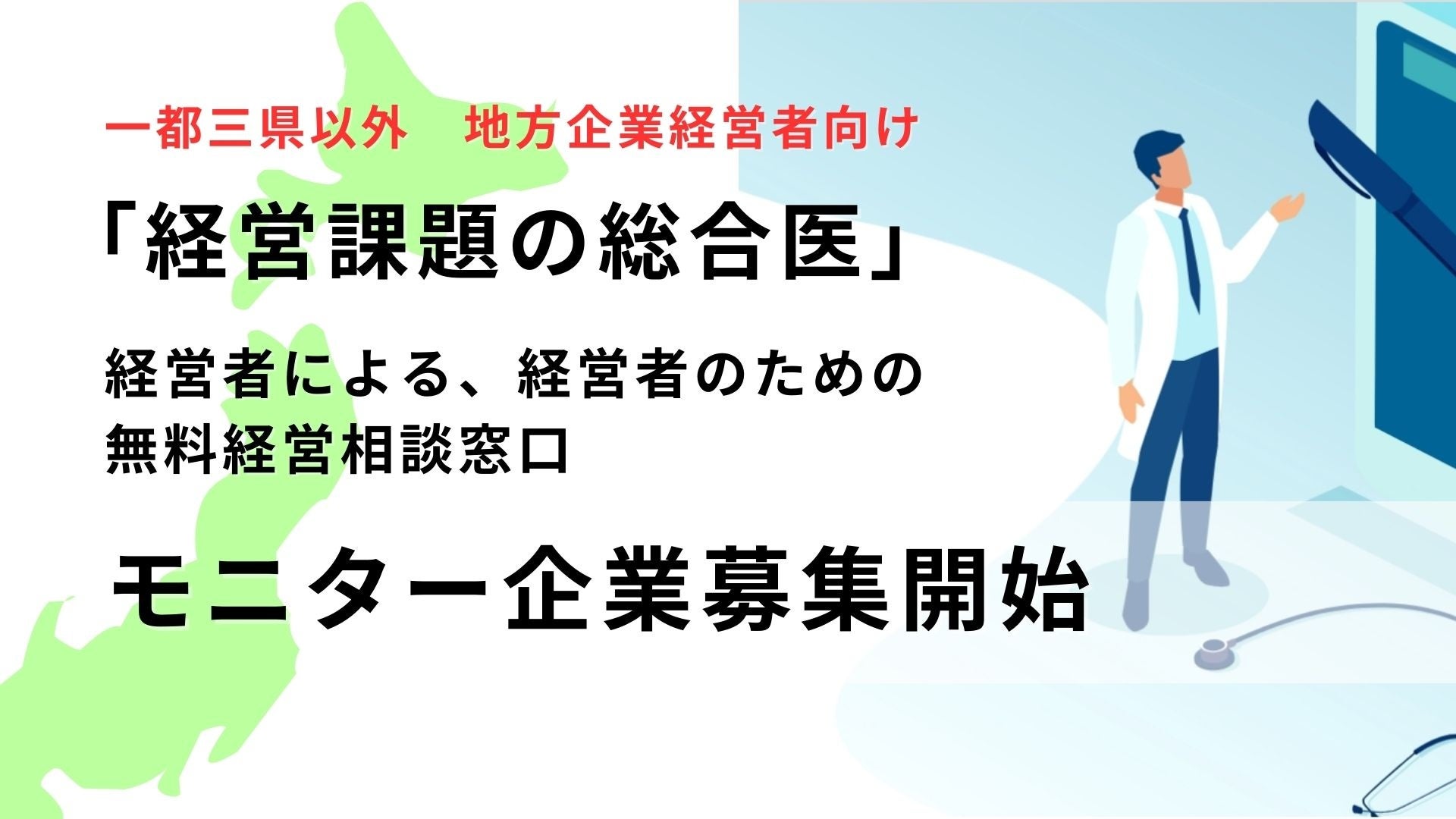 そのお声を受け、今回は一都三県を除く都道府県に拠点を置く地方企業を対象として「経営課題の無料相談(総合)医」のモニター企業の募集を5社限定で開始いたしました。