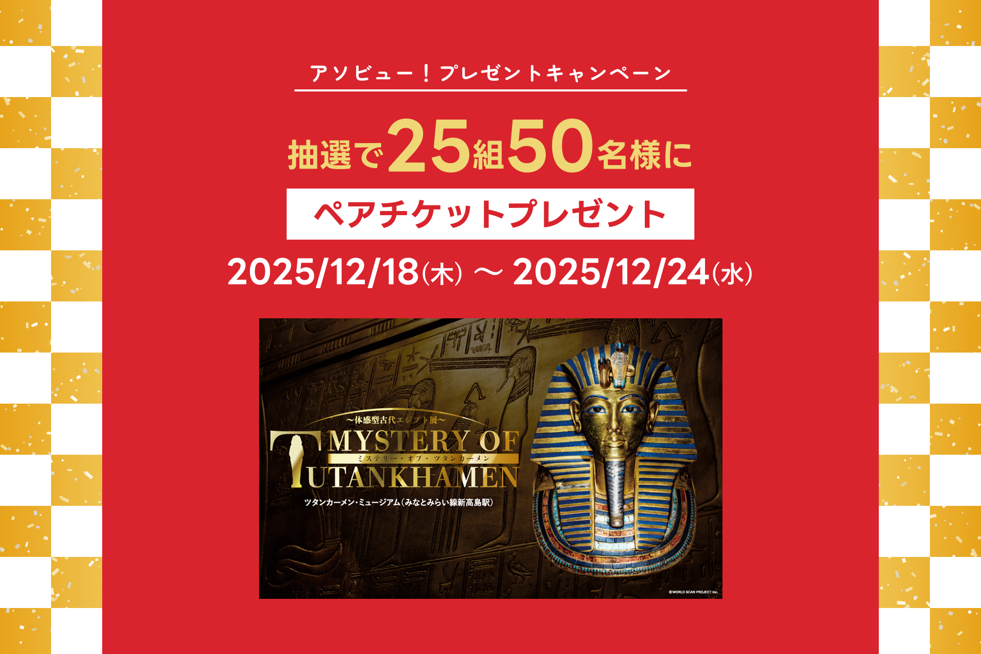 休日の便利でお得な遊び予約サービス「アソビュー!」(URL:https://app.adjust.com/138x1dst、以下:アソビュー!)を運営するアソビュー株式会社(所在地:東京都品川区、代表執行役員CEO:山野智久、以下:当社)は、「MYSTERY OF TUTANKHAMEN 体感型古代エジプト展<ペアチケット>」が抽選で25組50名様に当たるプレゼントキャンペーンを、2025年12月18日(木)より開始します。