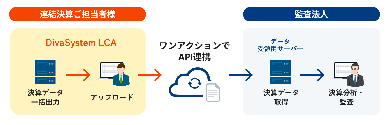「DivaSystem LCA」を利用する連結決算ご担当者様が、監査調書の元データとなる決算データを一括出力し、高度なセキュリティ環境下にあるEY新日本のデータ受領サーバーへワンアクションでAPIデータ連携を行います。