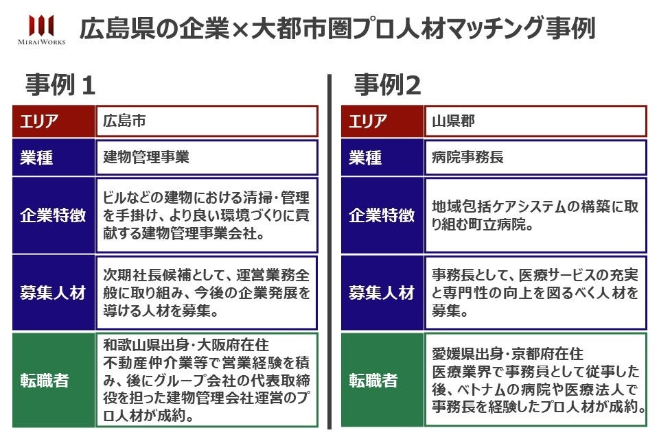株式会社みらいワークス(本社:東京都港区、代表取締役社長 岡本 祥治、以下「当社」)は、広島県(知事 湯崎 英彦)の県内企業へのUIJターン転職促進と中山間地域での副業人材活用推進に関する二つの業務(*1)を受託したことをお知らせいたします。今後、当社は広島県内企業の魅力を発信することで、広島県企業への転職や副業を希望する都市部プロフェッショナル人材を発掘、マッチングし、地域活性化を促進します。