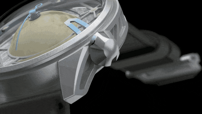 宇宙船をモチーフに設計されており、ケース、ケースのバックレンズ、バックルなど、流線型のデザインを多く取り入れています。ダイヤルの中央には、スーパールミノバの発光コーティングが施されたアルミニウム製の立体の月が取り付けられており、暗所では針の影の位置から時刻を読み取ることができます。