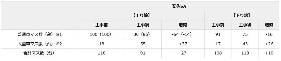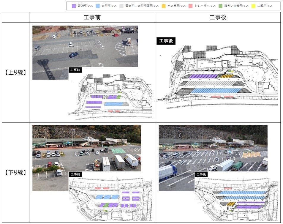 ・大型車駐車可能台数は、上り線で約3倍(+37台)、下り線で約2.5倍(+26台)に拡充
