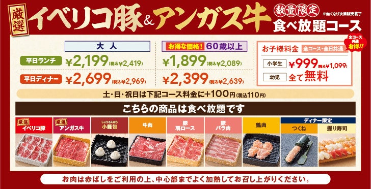 株式会社すかいらーくレストランツ(本社・東京都武蔵野市、代表取締役社長 中島尚志)が運営する「しゃぶ葉」では、未就学児のお客さまの料金を、全コース・全日「無料化」いたしました(※)。また、2022年12月8日(木)より、「イベリコ豚&アンガス牛 食べ放題コース」の販売を開始いたします。