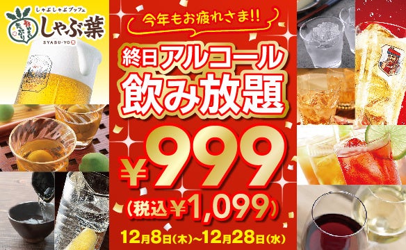 - アルコール飲み放題が終日999円(税込1,099円)!「今年もお疲れさまキャンペーン」開催