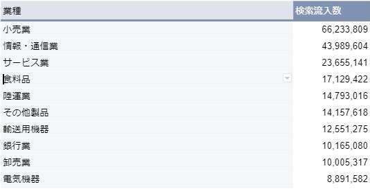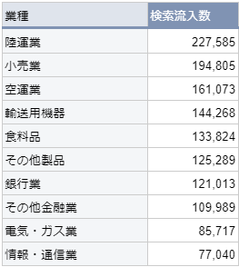 以下は、ウェブサイトの業種ごと検索流入数の平均値が高い順に10業種抽出したもです。陸運業・空運業と分類される鉄道および航空業界のウェブサイトは、いわゆるコーポレートサイトとtoCへのサービスサイトが同一ドメインで提供されることが多いことも上位である一因と考えられます。