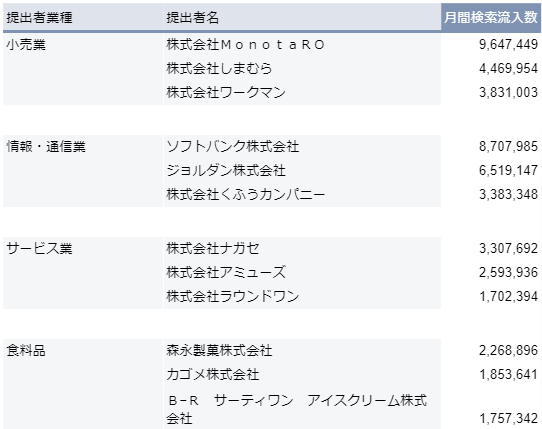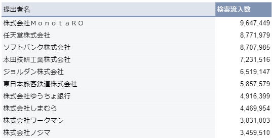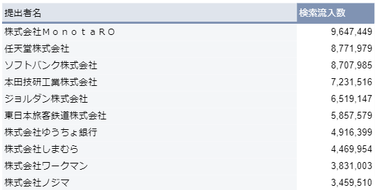 以下は、上場企業3,909社のウェブサイトについて月間検索流入数を調査したうち上位10社を抽出したものです。1位はECサイトを運営する「株式会社MonotaRO」、2位は「任天堂」、3位が「ソフトバンク株式会社」という結果になりました。