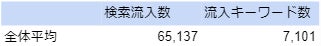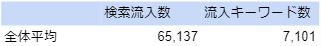 以下は、当調査における検索流入数と検索キーワード数の平均を示したものです。検索流入数の平均は65,137となりました。Ahrefsによる過去の調査により、検索流入が1ヵ月あたり1,000を超すウェブサイトは0.21%と非常に少なく、検索流入数が1ヶ月あたり0のウェブサイトが90.63%であることから鑑みれば上場企業ウェブサイト群の平均は低い数字ではないと考えられます。