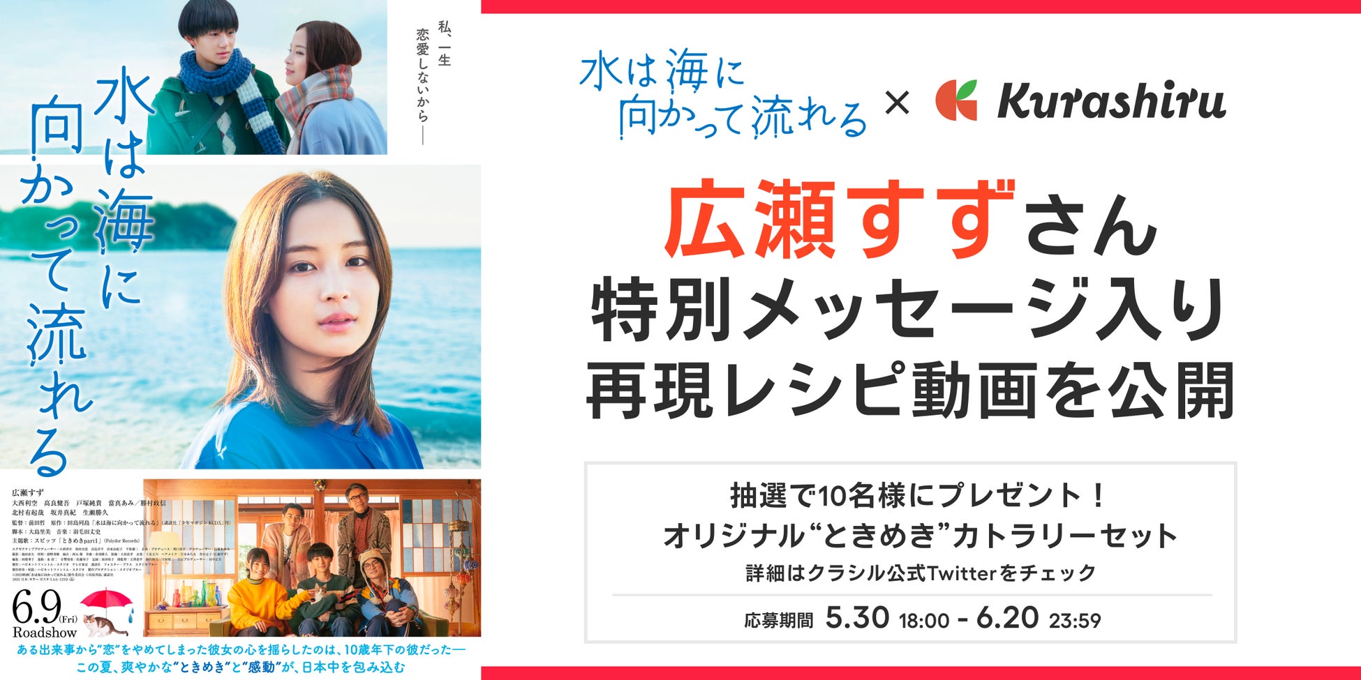動画には広瀬すずさんも登場します。また、「クラシル」公式ツイッターアカウント(https://twitter.com/kurashiru0119 )および映画公式アカウント(https://twitter.com/mizuumi_movie?s=20 )をフォロー&RTすると映画オリジナルカトラリーセットがもらえるキャンペーンも実施中です。映画とあわせて、ぜひお楽しみください。