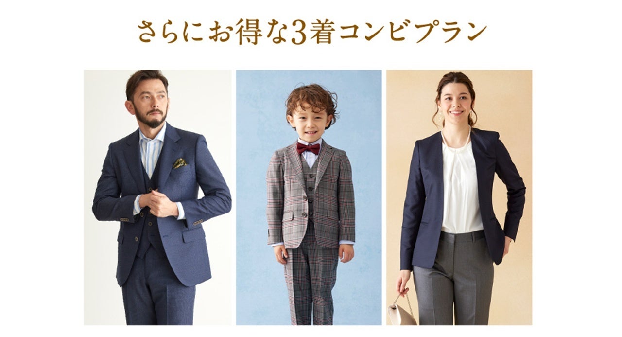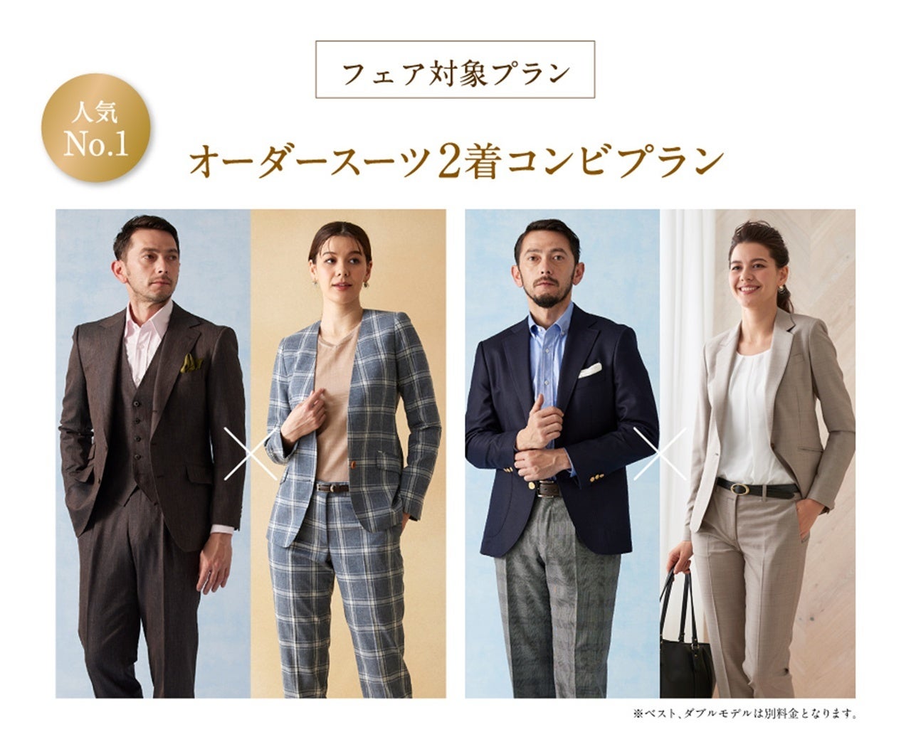 ※コンビプランとは・・・オーダースーツ2着以上ご購入していただいた場合の1着あたりのお値段です。組み合わせは自由ですので、異なる価格帯のオーダースーツと組み合わせていただいても本価格が適用されます。