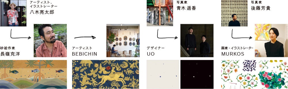インテリア内装材·壁紙ブランド「WhO(フー)」(野原グループ株式会社 本社:東京都新宿区 代表取締役社長:野原弘輔)は、クリエイターからクリエイターへ紹介によって数珠のようにバトンをつなぎ、壁紙をデザイン、商品化していくリレー企画『CREATORS CIRCLE』より、砂絵作家の長嶺克洋(ながみね かつひろ)、アーティスト BEBICHIN(べビチン)、デザイナー UO(ウオ)、#ARTGOESONとの取り組みから画家・イラストレーター MURCOS(ムーコス)の4名がデザインする新柄5点をラインナップしました。