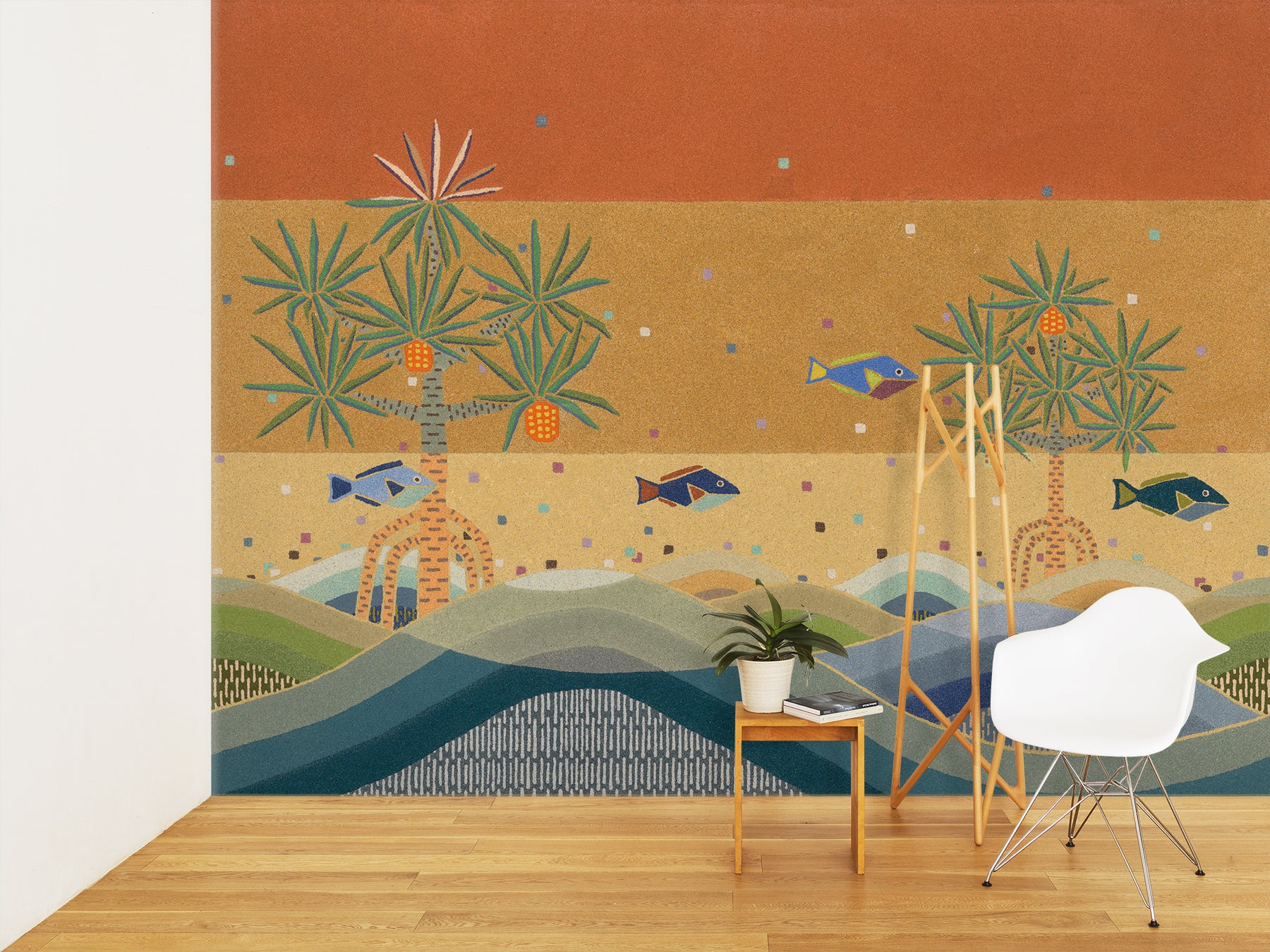 沖縄の砂浜の砂を用い、「アダン」と「波」をモチーフにしたえを描きました。この壁紙が使用される様々な場所で、沖縄のビーチで南の島の風に吹かれる感覚になってもらえたらいいなと思い制作しました。