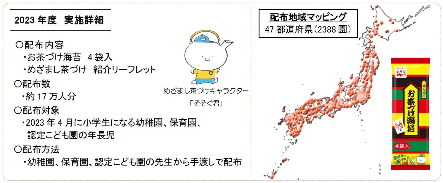 株式会社 永谷園(社長:成田 健一、東京都港区)は、2022 年3 月に実施して反響をいただいた大規模体験企画「お茶づけ海苔」のサンプリングを、今年は配布地域を全国47 都道府県に広げ、2023 年4 月に小学生になる幼稚園・保育園・認定こども園の年長児を対象に2023 年3 月上旬より実施いたします。