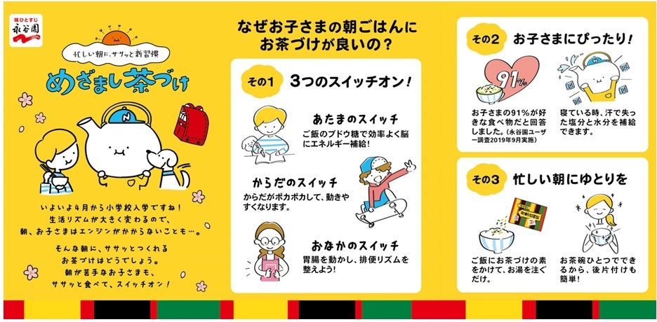 子どもが小学校に上がることは家族にとってはとても嬉しい出来事ですが、新しい毎日は生活リズムや生活環境が大きく変化するため、子どもにも親にも様々な不安が生じます。特に、朝のバタバタの原因にもなる、子どもが「朝起きられない」「朝食をなかなか食べてくれない」ことに対して悩みや不安を持つお父さんお母さんも多いのでは?そんな新しい生活を迎える親子の不安を解消するツールとして、昨年から「めざまし茶づけ」のご提案と「お茶づけ海苔」のサンプリングを実施しています。