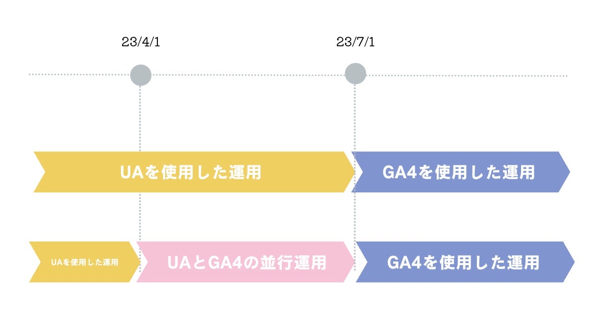 2023年7月1日以降のデータはユニバーサルアナリティクスで計測がされないので、GA4で計測できる環境を整えておく必要があります。そして、ユニバーサルアナリティクスとGA4の数値差を見たい場合は「2023年4月1日まで」に導入しておくことがおすすめ。