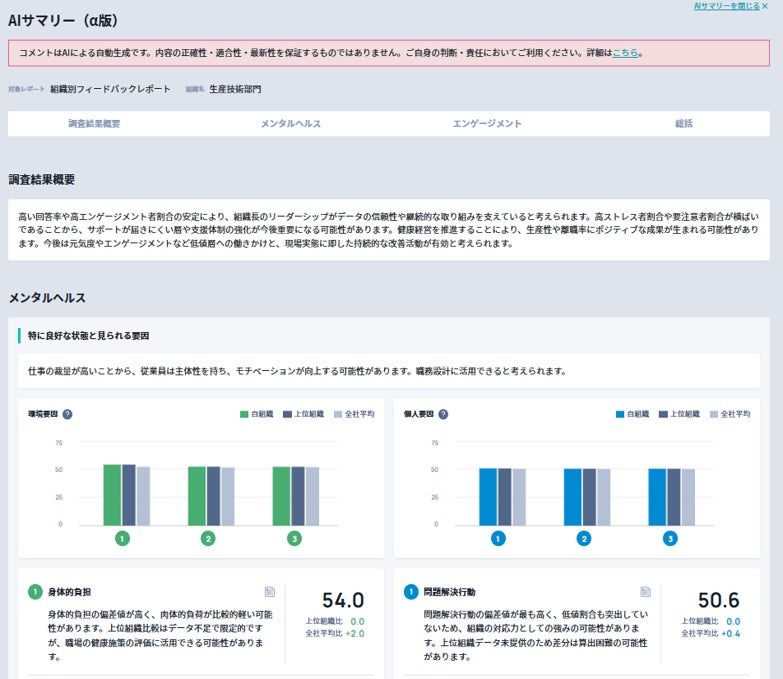 株式会社アドバンテッジリスクマネジメントは、人事労務関連データを集約するデータマネジメントプラットフォーム「アドバンテッジ ウェルビーイング DXP(以下、DXP)」において、当社ストレスチェックサービス「アドバンテッジ タフネス」から発行されたレポートを取得できる新機能と、取得したストレスチェックレポートを基にAIが自動で要約する「AIサマリー(α版)」をリリースいたしました。