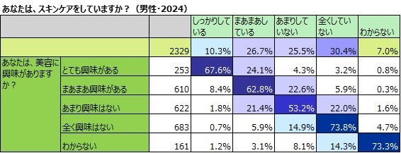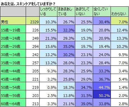 20~24歳男性「しっかりスキンケアしている」21.3%で、40歳以上の女性の「しっかりスキンケアしている」割合よりも多い。