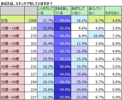 次にスキンケアをしているか否か女性に聞いた結果です。全体では「しっかりしている」21.7%と「まあまあしている」49.6%を合わせた71.3%が「している」と答えています。女性の「している」の割合が最も多いのが15歳~19歳で「しっかりしている」32.0%「まあまあしている」50.0%を合わせて82.0%です。すべての年代でスキンケアをしていると答えたのが8割を超えるのは、15歳~19歳の世代のみです。女性の「している」割合は、15歳~19歳の世代以外はすべての世代が7割程度で昨年と比較しても大きな差はないようです。女性のなかで15歳~19歳が最もスキンケアをしていると答えたのは意外な結果でしたが、今回から調査年齢を5歳下げたことにより分かった事実です。
