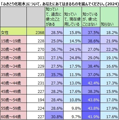 ③ 「ふきとり化粧水」の認知率上昇、男性約4割、女性約8割。使用率は男性9%・女性15.8%。