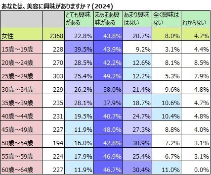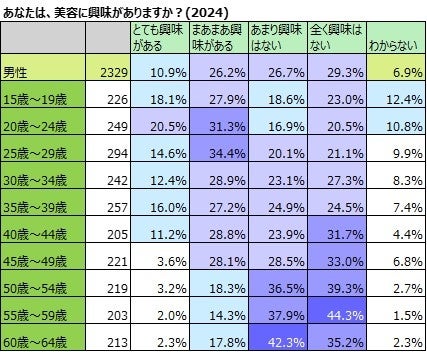 最も興味があるのは男性で20歳~24歳、女性で15歳~19歳。スキンケアの実施と美容への興味は、男性の方がぴったりリンクしている。