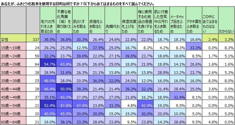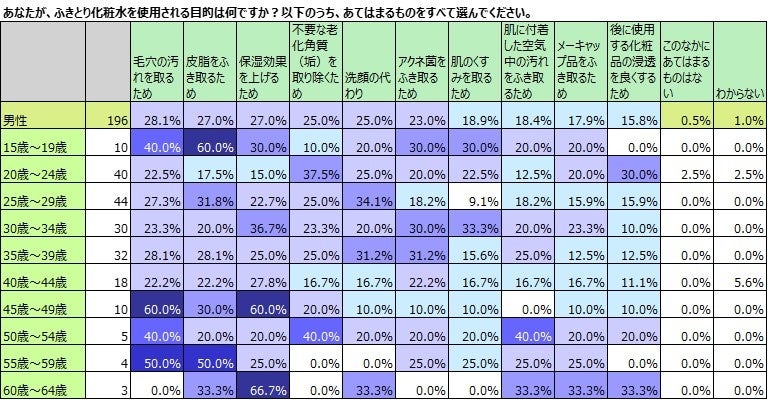 変化する美容意識、若齢男性の美容興味・美容行動は高齢女性を上回る。多岐にわたるふきとり化粧水の使用目的が明らかに。