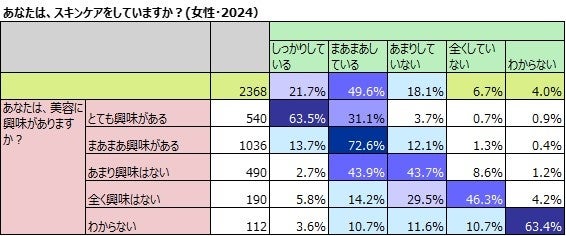 また、スキンケアの実施と美容への興味を掛け合わせてみると、男女ともにほぼリンクすることがわかりました。特に男性はぴったりとリンクしています。女性は、あまり興味がないもののスキンケアを「まあまあしている」割合が43.9%で「あまりしていない」43.7%を上回りました。スキンケアに関しては、男性の方が女性よりも興味と行動が一致していることがわかりました。