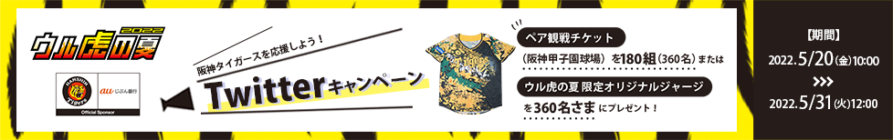 本キャンペーンは、auじぶん銀行Twitter公式アカウントをフォローし、対象のキャンペーン投稿をリツイートしていただいたお客さまの中から抽選で「阪神タイガース ペア観戦チケット」もしくは「ウル虎の夏2022 限定オリジナルジャージ」のどちらかをランダムでプレゼントします。当落の結果はその場でわかります。