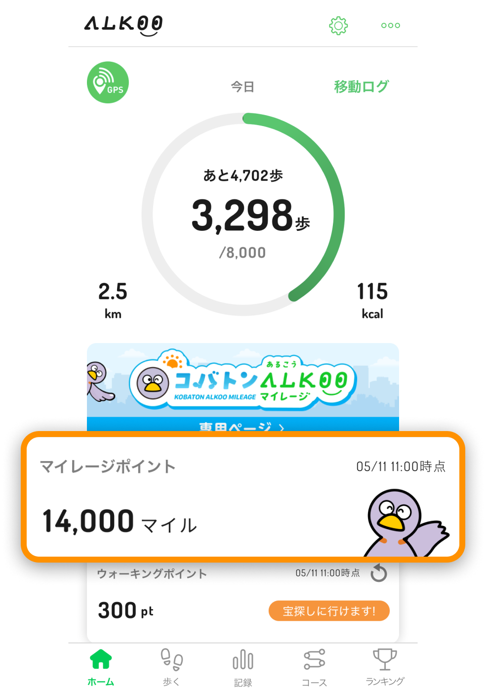 『ALKOO by NAVITIME』アプリから「コバトンALKOOマイレージ」に登録することで利用できます。