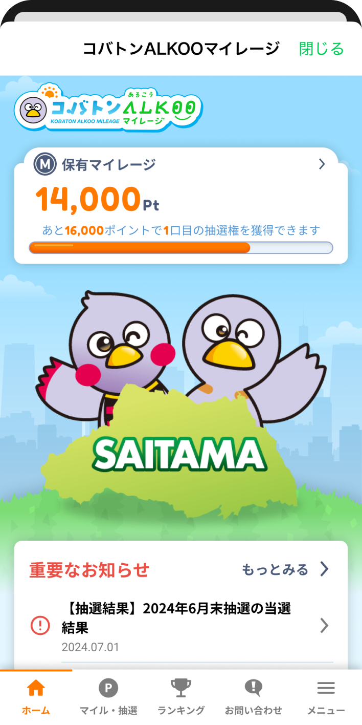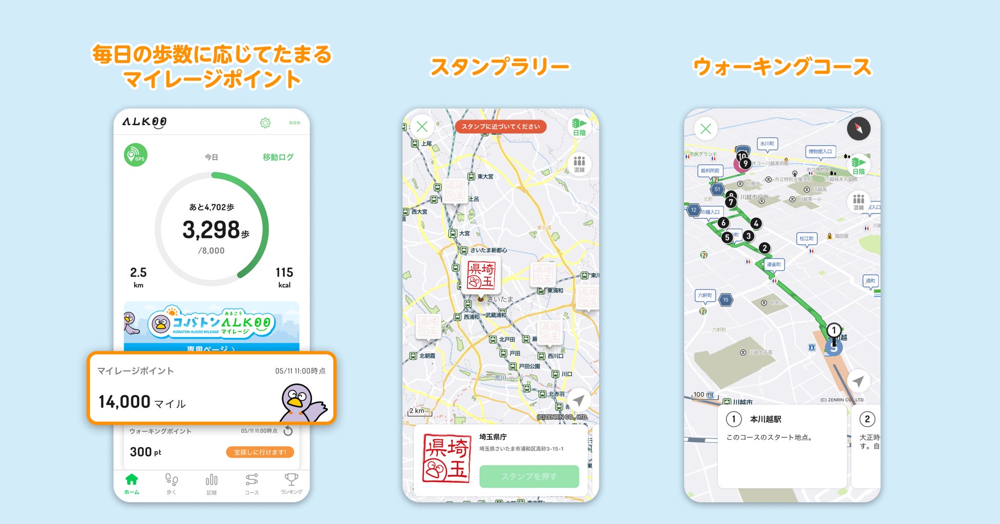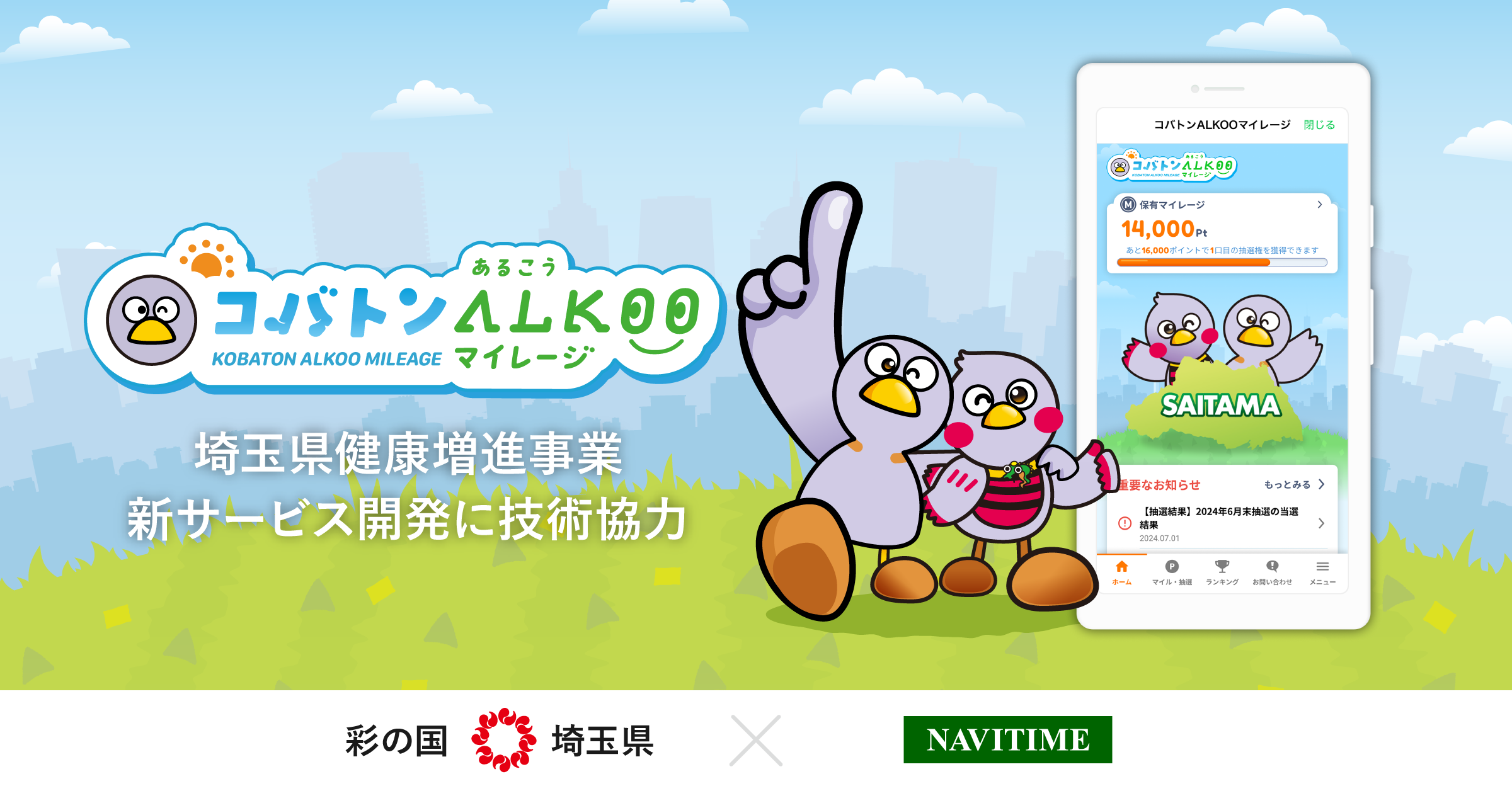 埼玉県(知事:大野 元裕)では、2017年度から、アプリをダウンロードした自分のスマートフォンまたは専用歩数計を持って歩くとポイントが貯まり、抽選で賞品が当たるなど、楽しみながら健康づくりができる「埼玉県コバトン健康マイレージ」を実施しています。今回、ナビタイムジャパンのウォーキングアプリ『ALKOO(あるこう)by NAVITIME』を利用し、「コバトンALKOOマイレージ」として提供します。
