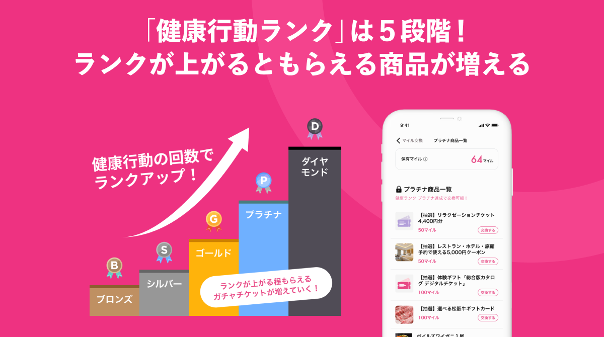 新機能として登場した「健康行動ランク」には、ブロンズ/シルバー/ゴールド/プラチナ/ダイヤモンドの5段階のランクがあり、食事記録など主に健康行動を記録した回数で「健康行動ランク」が変動します。また、ランクに応じて交換できる商品が変わります。