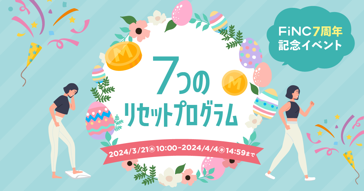予防ヘルスケア×AIテクノロジー(人工知能)に特化したヘルステックベンチャー株式会社FiNC Technologies(本社:東京都千代田区、代表取締役 CEO兼CFO:小泉 泰郎、以下「当社」)が提供するヘルスケア/フィットネスアプリ「FiNC®︎」は、本日2024年3月21日(木)より、FiNCアプリ7周年記念「カラダも新生活!7つのリセット☆プログラム」のイベントを開始いたします。