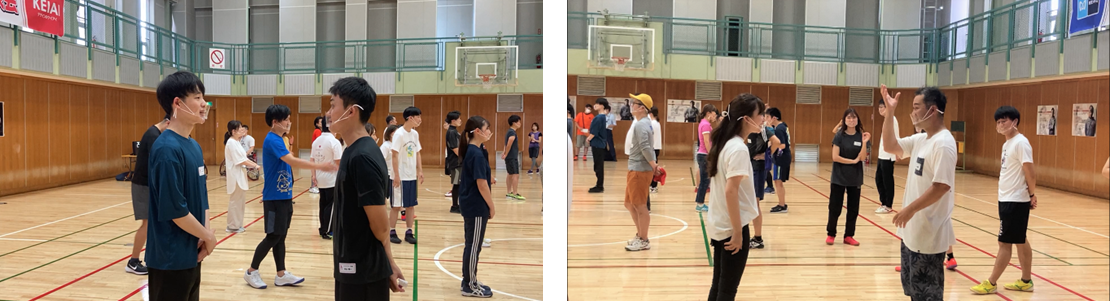 デフのアスリートが主導となり、口の動きだけで言葉を伝える伝言ゲームとジェスチャーゲームを行いました。伝言ゲームでは「たまご」と「たばこ」を題材にし、母音が同じ言葉を口の動きだけで伝える難しさに触れました。ジェスチャーゲームでは「パトカー」と「救急車」を題材に同じ特徴がありながら異なる車両を体の動きだけで伝え、また理解することの難しさに触れました。