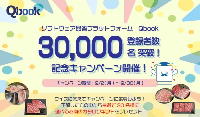 ソフトウェアのテスト・品質向上トータルサポート企業のバルテス・ホールディングス株式会社(本社:大阪市西区、東京都千代田区、代表取締役会長 兼 社長:田中 真史)のグループ会社、バルテス株式会社が運営するソフトウェア品質向上プラットフォーム「Qbook」のエンジニア登録者数が30,000名を突破いたしました。これに伴い、『30,000名突破記念! お肉のギフト プレゼントキャンペーン』を実施いたします。