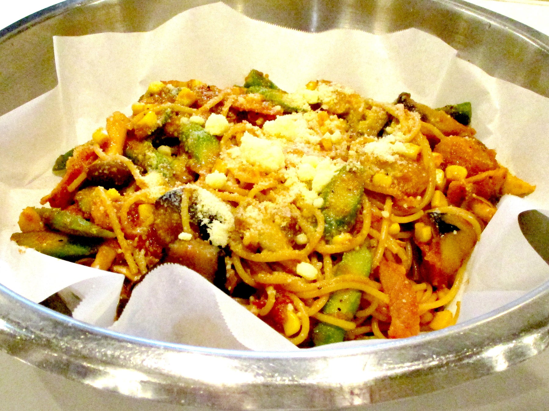 旬のトマトととうもろこしの甘みが溶け込んだ特製ソースを、もちもちのパスタに絡めました。ベーコン、アスパラ、なすなど具材もたっぷり。ガーリックの香りが食欲をそそります。