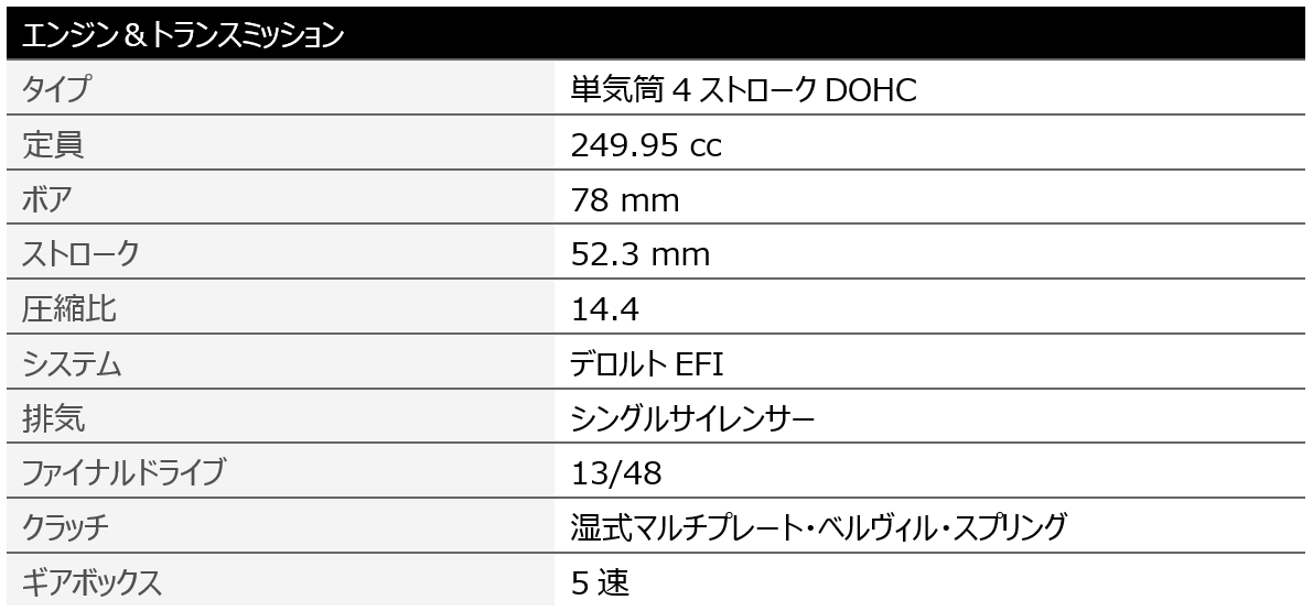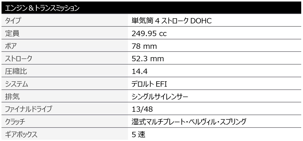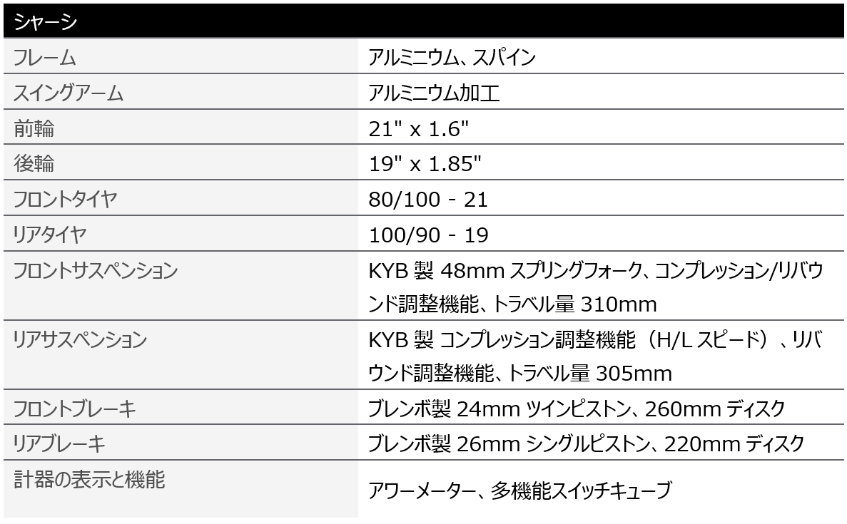ブレーキシステムは、プレミアムなブレンボ製ツイン24mmピストン・フローティング・フロントキャリパー、シングル26mmピストン・フローティング・リアキャリパー、ガルファー製フロント260mm、リア220mmディスクを装備。