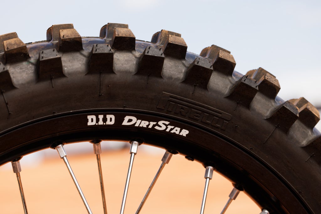 D.I.D製のダートスター7000シリーズ・アルミニウム・リムと削り出しアルミニウム・ハブに、ピレリ製スコーピオンMX32ミッドソフト・タイヤを装着。
