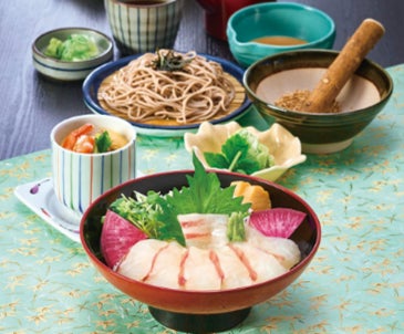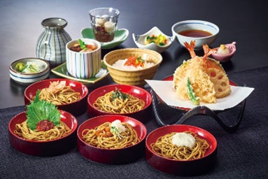 サガミの契約農場である、北海道雄武町産の【韃靼そば】“満天きらり“を使用した、サガミの【満天そば】を、多彩な薬味で食べる贅沢な御膳。揚げたての天ぷらにいくらご飯・茶碗蒸し・デザートのついた、心も体も満たされる逸品です。