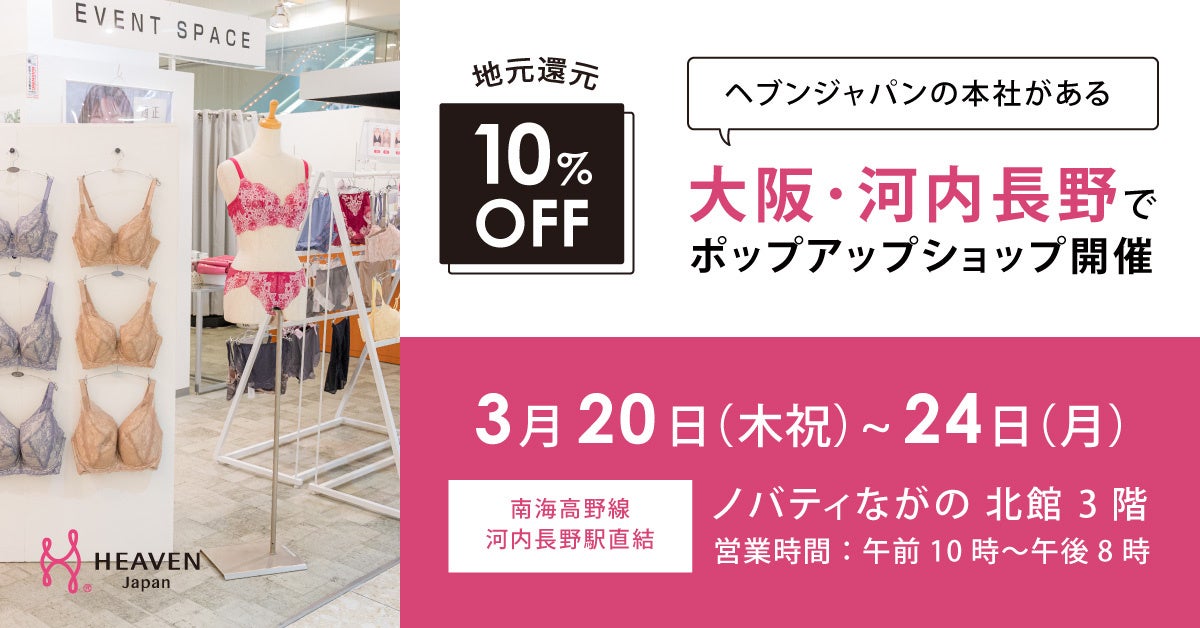 一人ひとりの女性の心と体に寄り添う「適正下着®」の開発から販売までを行う株式会社HEAVEN Japan(所在地:大阪府河内長野市、代表取締役:松田崇)は3月20日(木)〜3月24日(月)の期間中、河内長野駅直結のショッピングセンター「ノバティながの」にて、適正下着のフィッティング体験ができるポップアップショップを開催します。また、3月18日(火)〜3月24日(月)まで大阪府の南海高野線の8駅に自社制作した「河内長野?知らんけど」ポスターを8種掲示し、ポスターラリーを実施します。