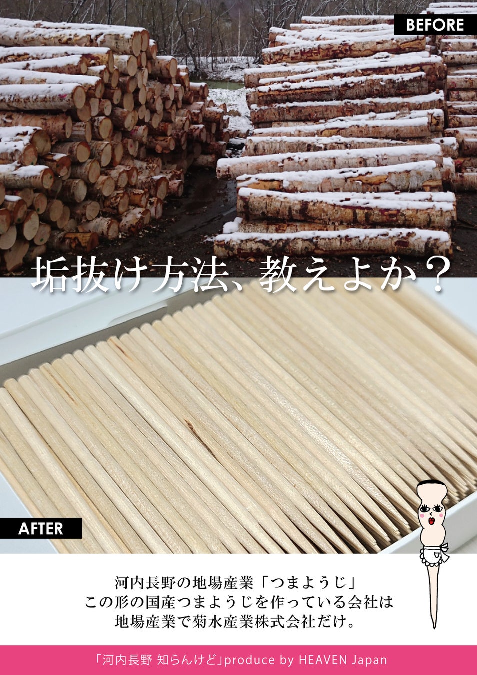 河内長野の地場産業「つまようじ」。菊水産業株式会社は、全国に2社しかない国産つまようじメーカーです。ゴツゴツした木材からシュッとしたつまようじになるように、私たちも垢抜けたいものです。