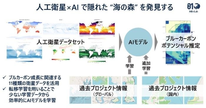 ME-Lab Japanが受賞したアイデアは「人工衛星データと転移学習を用いた広域ブルーカーボンポテンシャルの推定サービス」(詳細は後述)です。企業、個人、学生、異業種、宇宙業界関係者等からの幅広い応募より、事業/技術の妥当性、事業の実現性/収益性の観点で、NTT Comおよび株式会社NTTドコモの審査員により選出されました。
