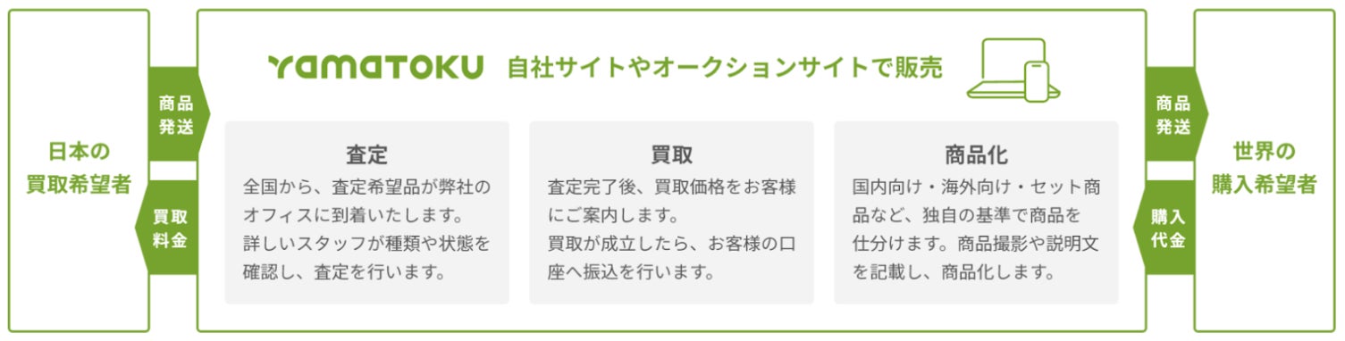 宅配買取とEC販売を軸に、ネット上でリユース品の売買を行います。宅配買取で商品を買い取り、それをECで販売する、すべての工程をネット上で行うリユース業を、ネット型リユース業と言います。 山徳の事業の9割以上を占めており、メインとなるビジネスです。また、関連するマーケティング、システム開発・保守、デザインなども内製しています。