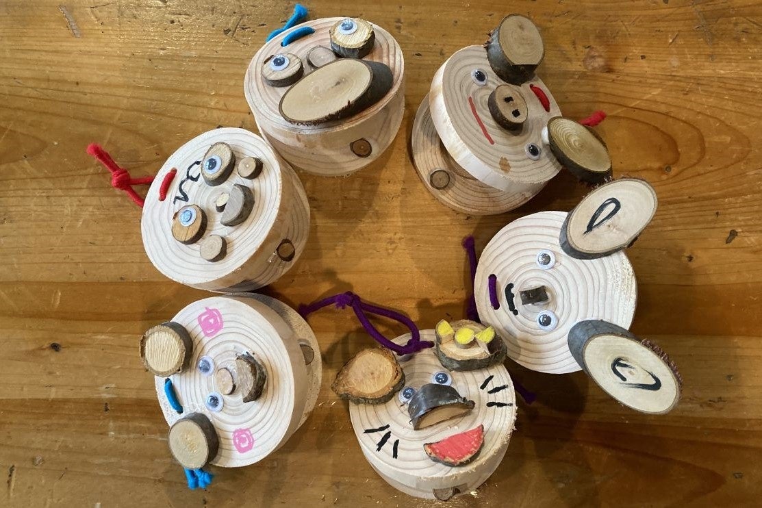 間伐材(かんばつざい)をはじめ、公園の木の実や枝を再利用した「動物カスタネット作り」