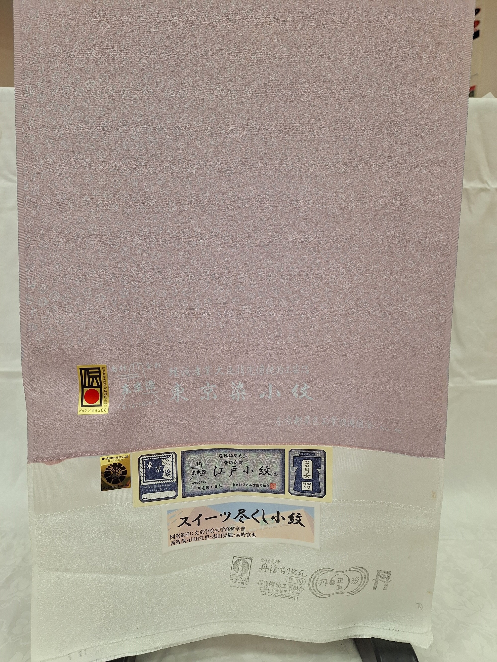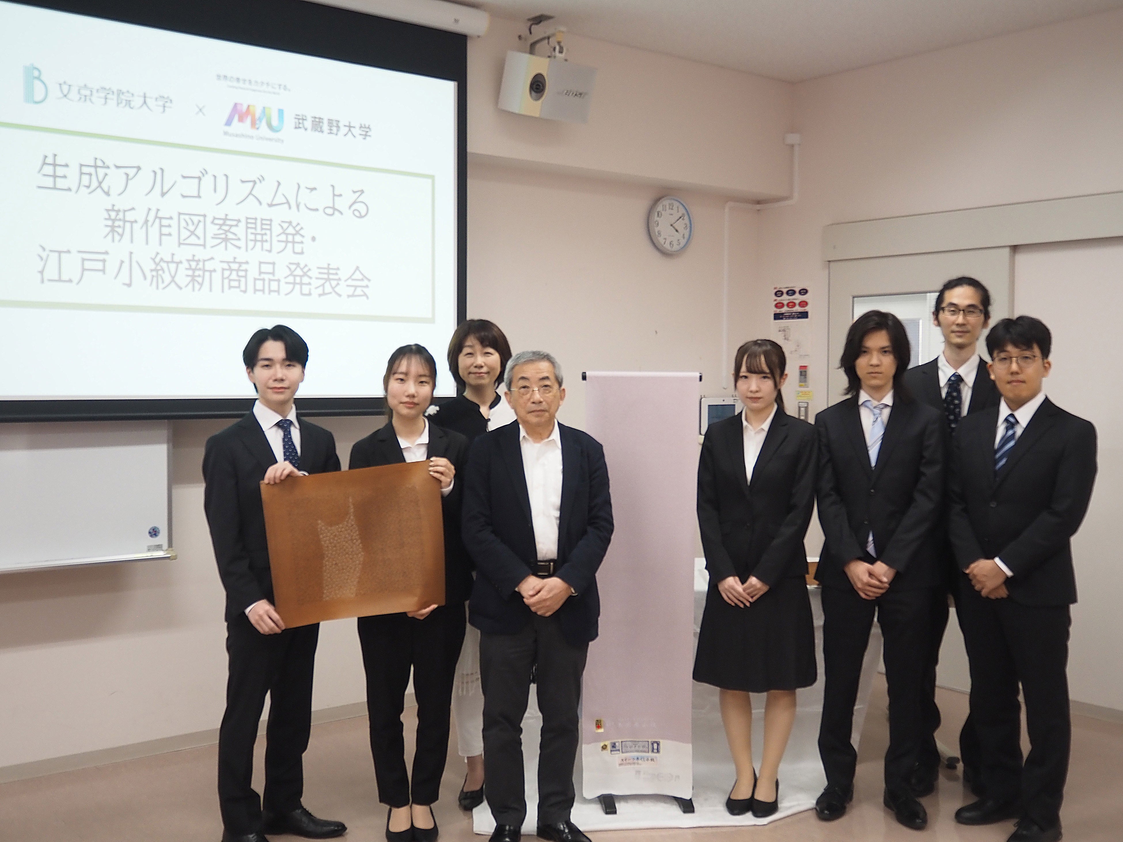 この度、本学は「江戸小紋」の特質のマーケティング調査を行い、そこで明らかになった図案の制作理論をもとに、武蔵野大学で開発したオリジナルの生成アルゴリズムを活用した新しい図案をもとに、江戸小紋新作「スイーツ尽くし小紋」ができました。本研究によって制作した新作江戸小紋図案の発表並びに、新図案で染めた新商品の発表会を5月29日に行いましたことをお知らせいたします。