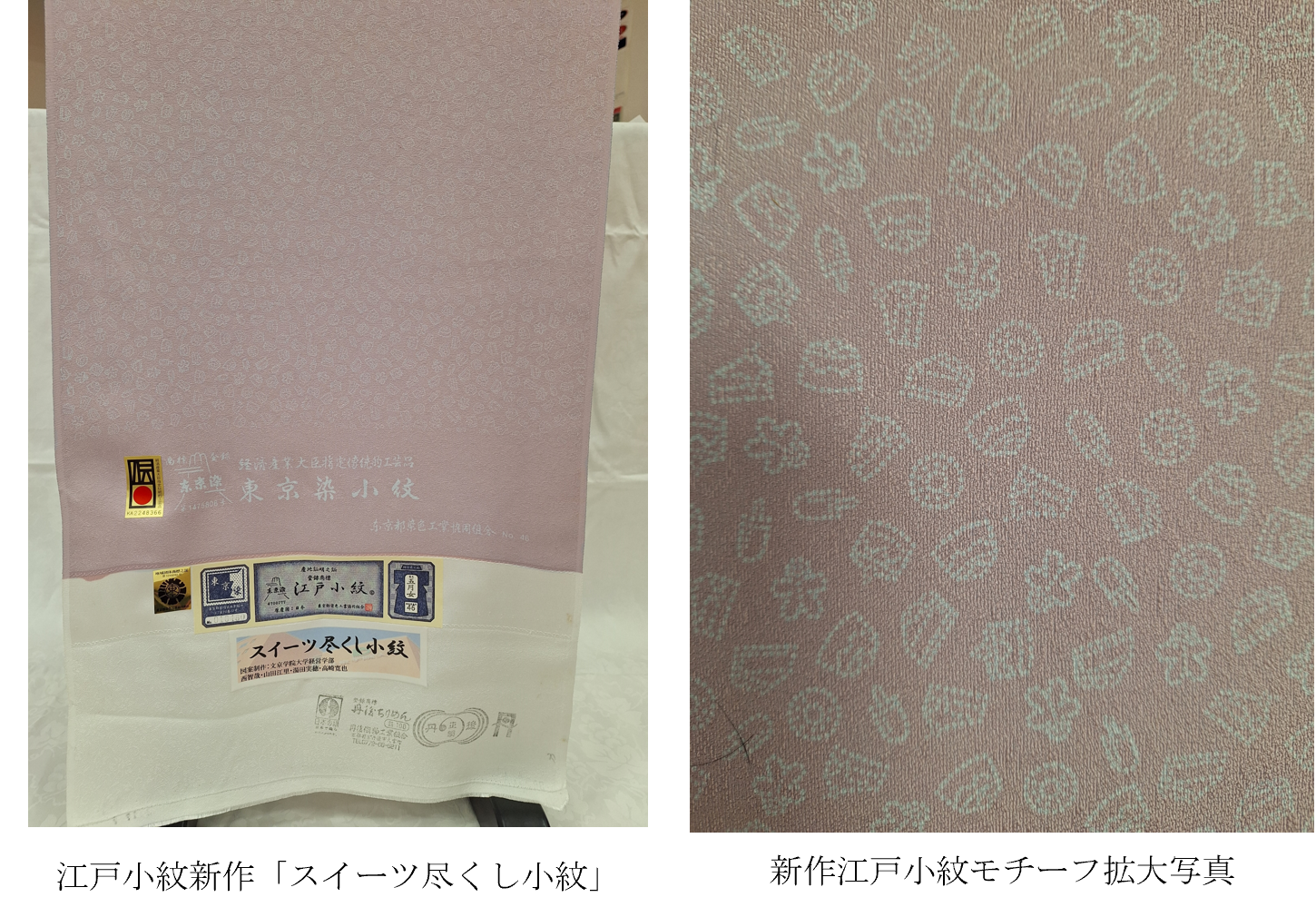 今回発表に至った新作モチーフは「スイーツ」で、発表する新作の商品名は「スイーツ尽くし小紋」です。モチーフを本学生が考案しており、「これまでにない」図案であるだけでなく、「スイーツらしく見える」ことを重視し、試作・配置・検証を重ね商品化に至りました。